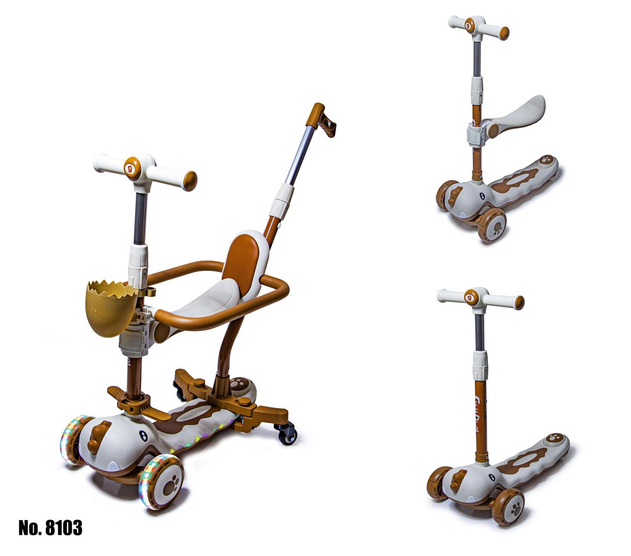 Самокат 5 в 1 Dinosaur 8103 з Бортиком, Підсвіткою і Музикою є багатофункціональним транспортним засобом, призначеним для тривалого використання. Ця модель самоката призначена для дітей від 10 місяців до 7 років і має величезну кількість переваг. Спеціально для найменших самокат обладнаний підставкою для ніг на кермі, батьківською ручкою та бортиками для безпеки малюка. За потреби всі деталі можна легко зняти.
